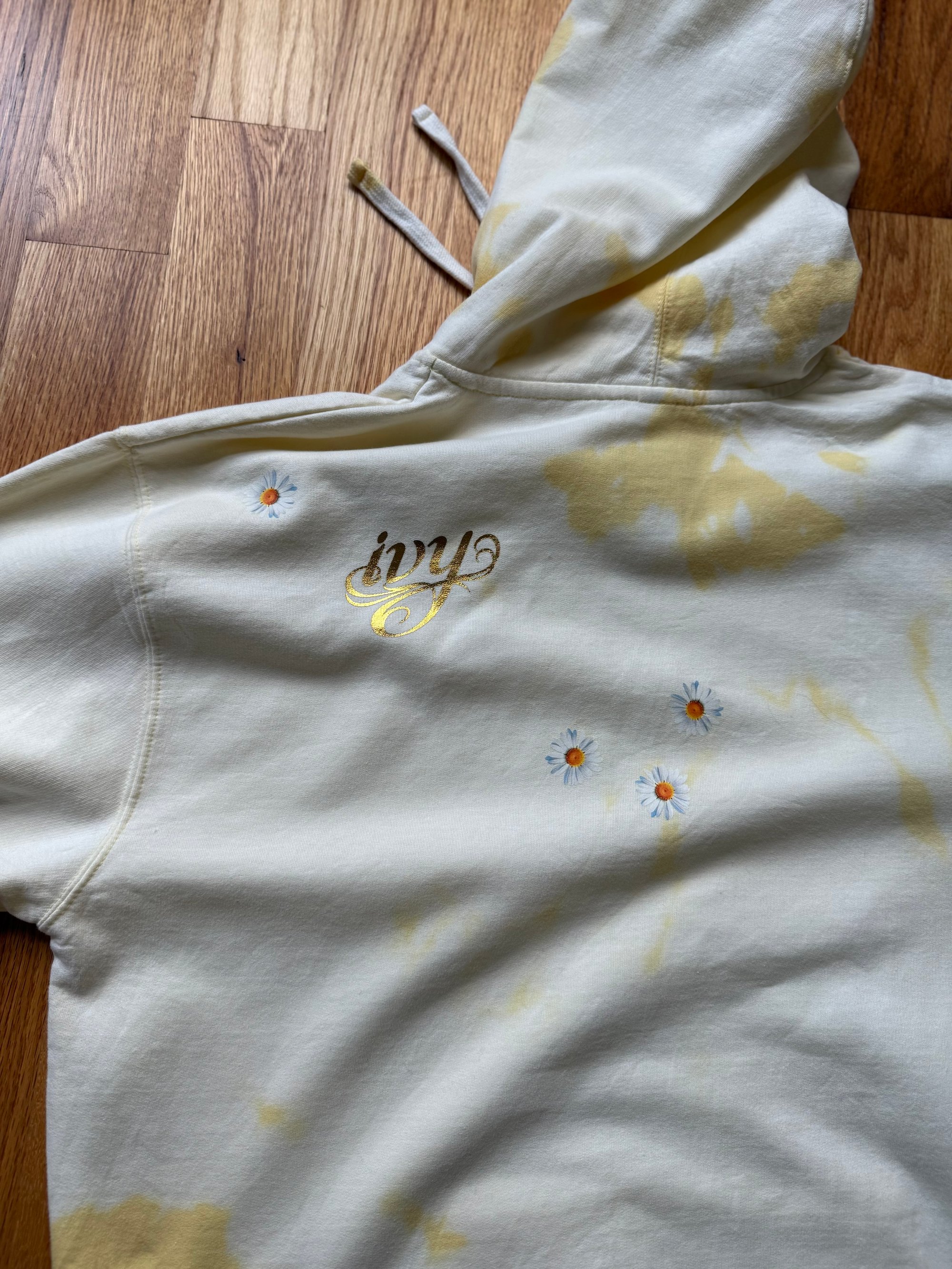 Simple beauty oozes from the minimalist flower known as the daisy. We took a yellow hoodie and added several flowers for some subtle simplicity. Enjoy this bright hoodie on any cold day.